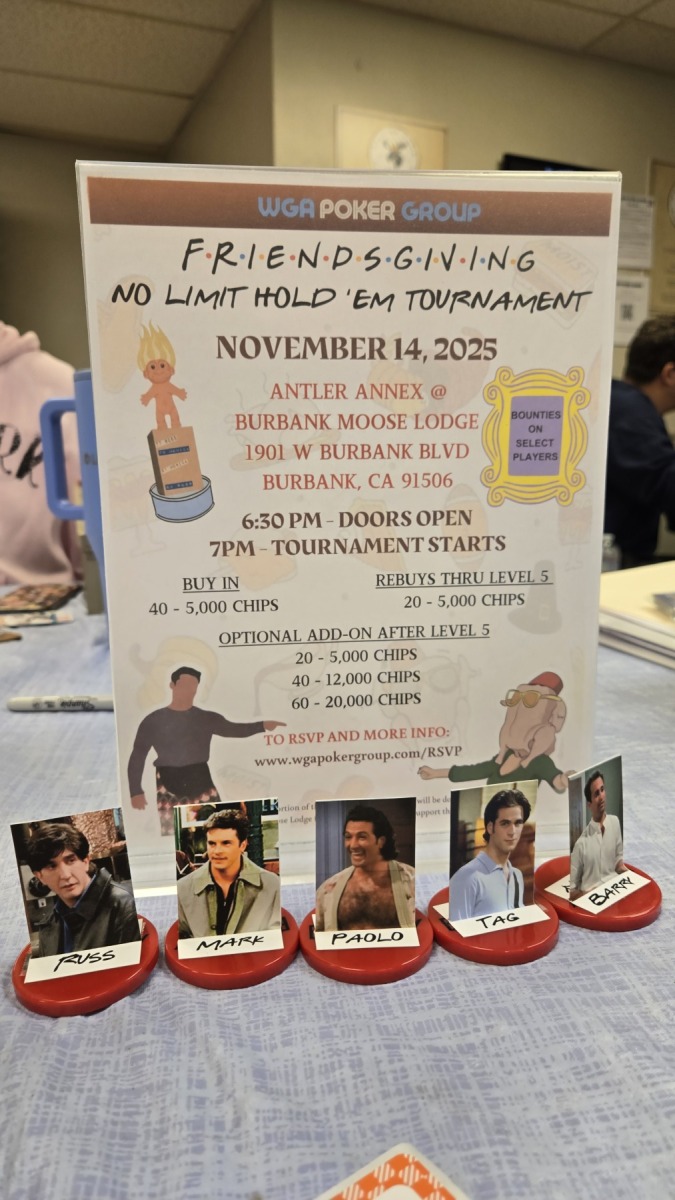 From the appetizer to the final dessert, this Phoebe buffet of a poker tournament had it all. I’d like to give thanks this Friendsgiving to all of you for making this WGA Poker Group so special. Let’s do it again soon… or more specifically, in January. Please stay tuned for updates via facebook or the e-newsletter. Also, please subscribe to our YouTube channel.