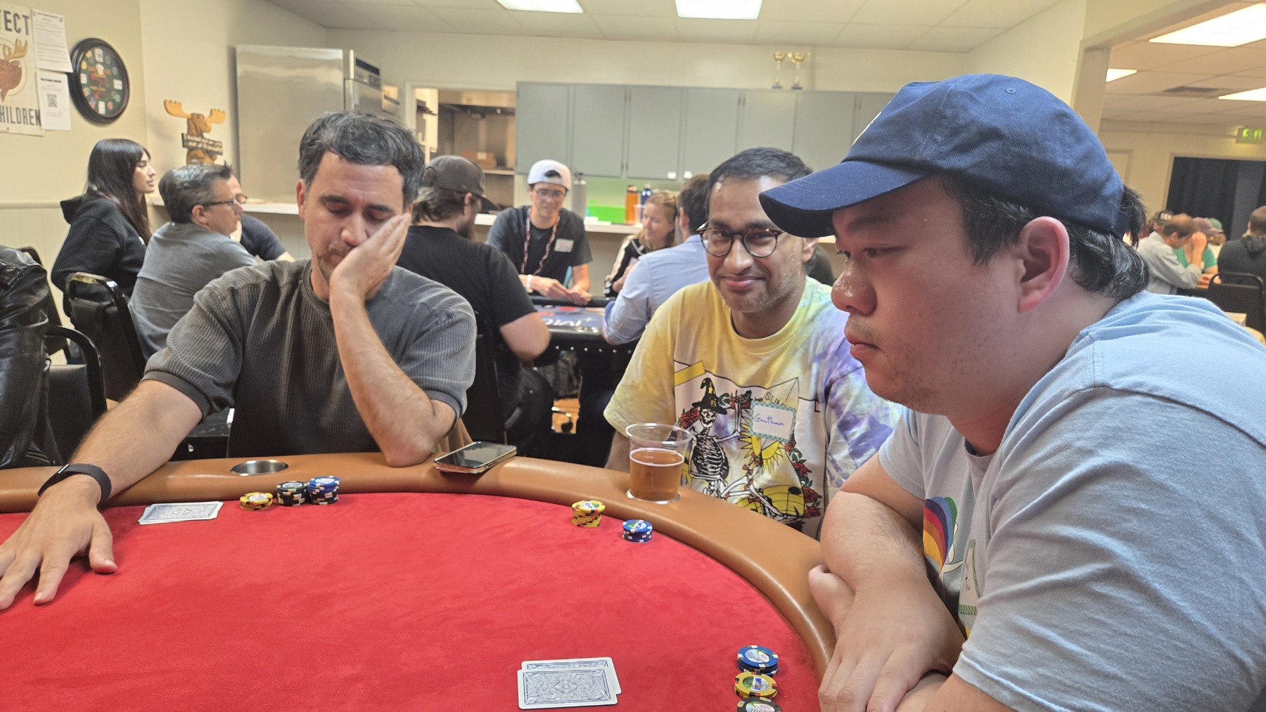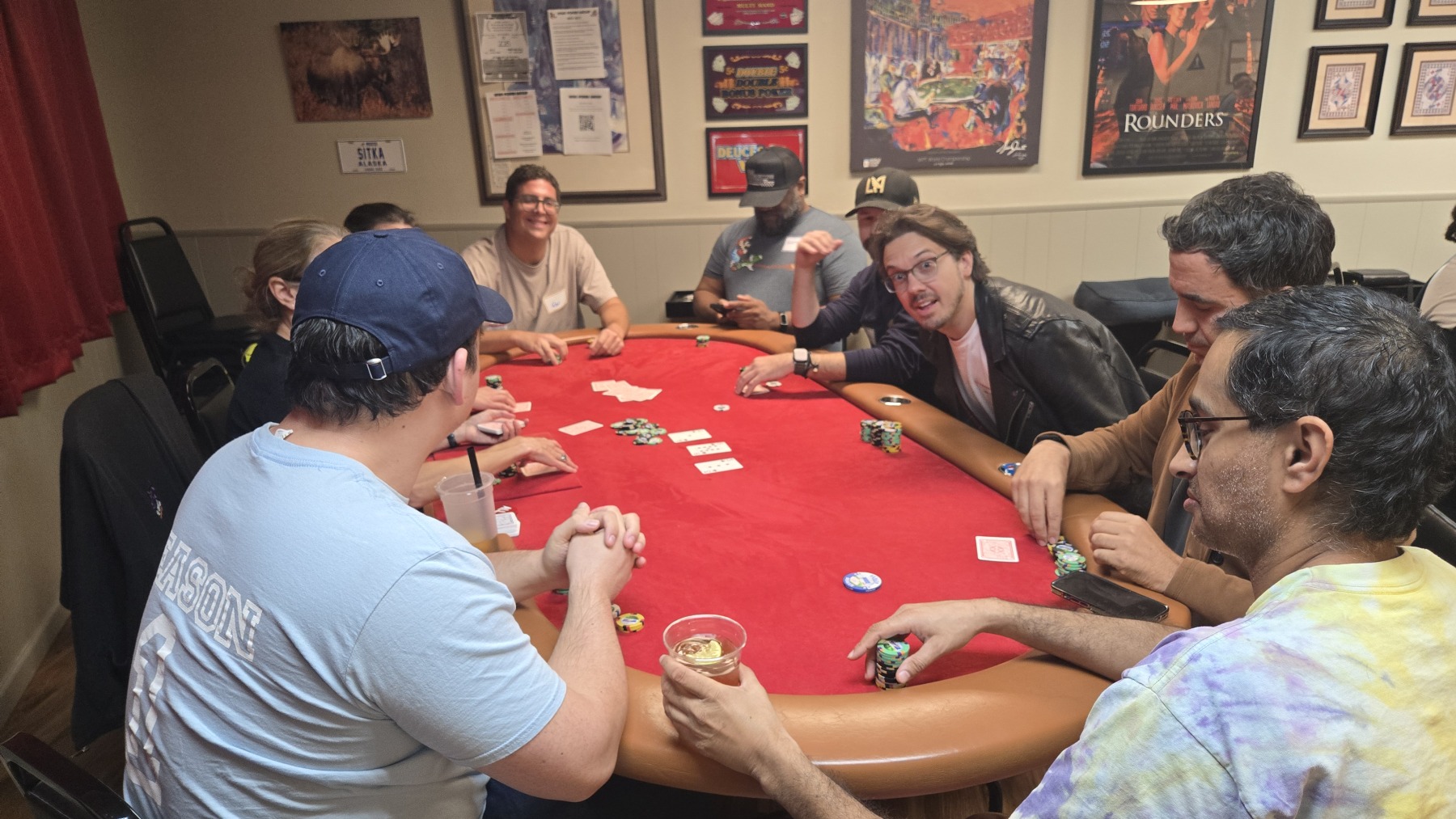 After several hours of play and birthday cake was consumed, we finally arrived to our final table of nine. The first to sink beneath the tide was Roy “Boy Toy Roy” Chang when his 3♦️️3♥️️ was swept out to sea by Joyce “JLeee” Lee’s A♠️️7♠️️. After getting their chips all-in, the dealer served up the flop — 8♣️️7♥️️5♥️️. Joyce snagged middle pair and the lead, but Roy still had hope. Unfortunately, the K♣️️ and 2♦️️on the turn and river locked up the pot for Joyce, leaving Roy with a tsunami of disappointment as he finished in 9th place. Hey, for your first time playing with us, that’s not bad!