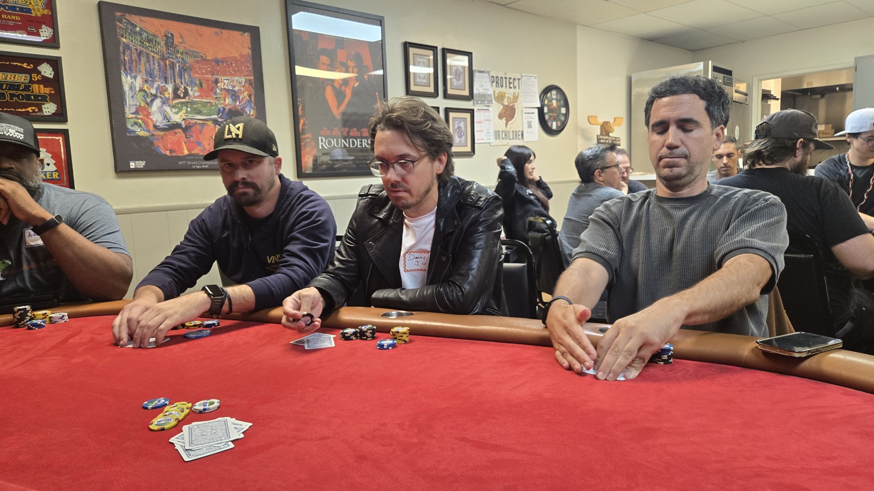 Short-stacked in the big blind, Robert “Arjay The Writer” Webb made his all-in entrance with J♣️️4♣️️. Three co-stars joined the scene, leading to a flop of 8♠️️5♠️️K♣️️. Dylan “The Druid” Brody bet, Mike “Nacho Plissken” Carreon called, and Waco O’Guin folded. The turn: T♣️️. Check-check. On the river: 2♥️️. Dylan fired again and Mike stepped aside. Robert’s Jack-high was no match for Dylan’s 9♣️️8♦️️ for a pair of eights. And with that brief but memorable performance, Robert was out in 8th place.