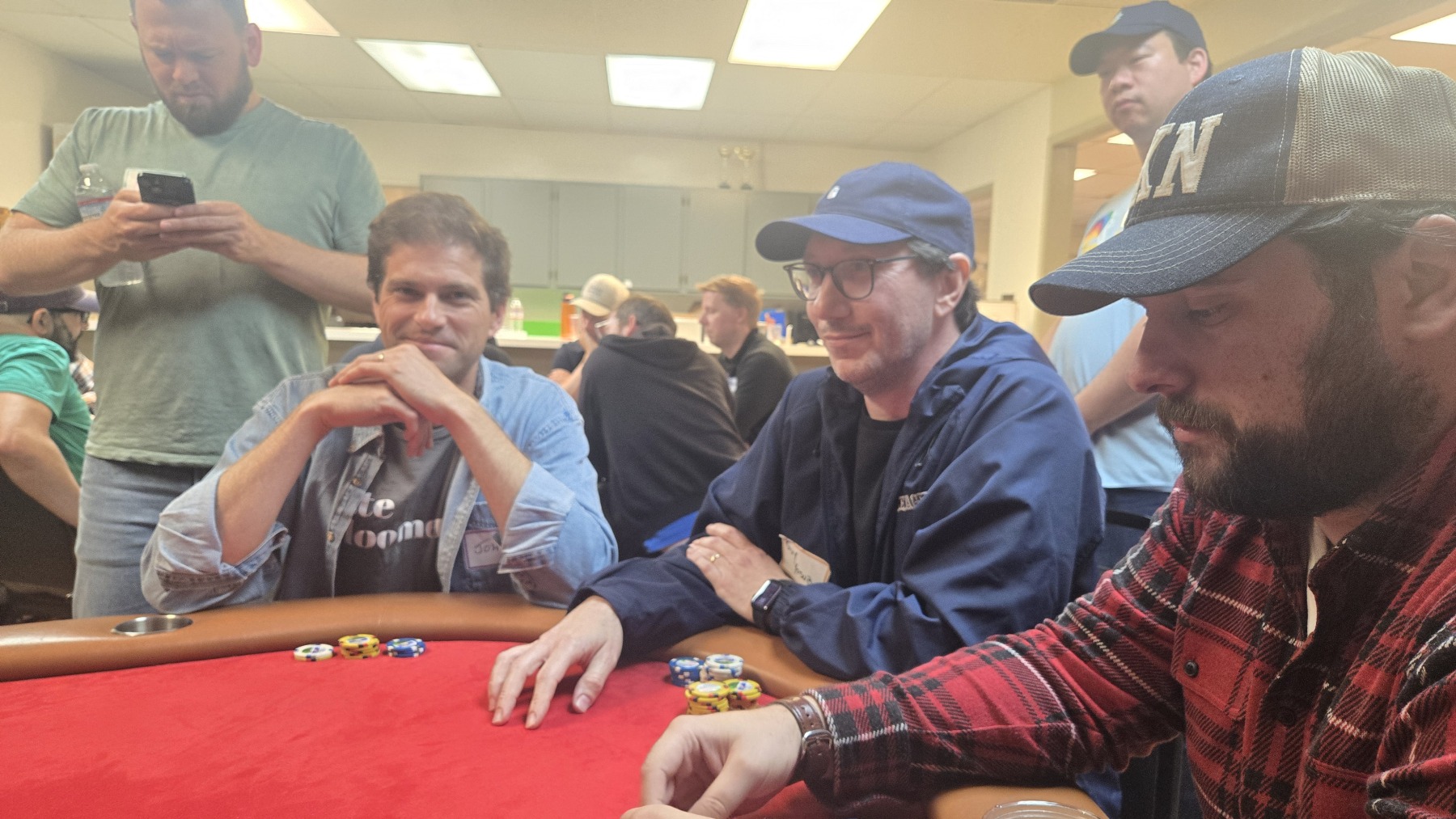 Producer and magician, Adam Cole, tried to conjure up some extra chips when he shoved all-in against Randi Barnes. Always the skeptic, Randi found a call. To our surprise, they revealed the same hand — A♥️️J♦️️ for Adam and A♠️️J♥️️ for Randi. Their hands should tie 97% of the time, but a flop of 7♠️️7♣️️3♠️️ gave Adam a sweat and Randi a freeroll as she held the valuable A♠️️ in her hand. The turn — 2♠️️. Could it be? Runner-runner flush? No one is THAT lucky. The dealer slowly peeled the river… T♠️️! Shock and awe filled the room as Randi made the nut flush, leaving Adam with just 7k in chips. Though he managed a quadruple-up shortly after, the ocean currents pulled him under when he was forced all-in with 6♦️️3♦️️ against Grant’s A♦️️K♠️️. The board of Q♥️️6♥️️A♠️️5♣️️A♣️️ meant Grant’s trip aces would sink Adam like the Titanic in 6th place.