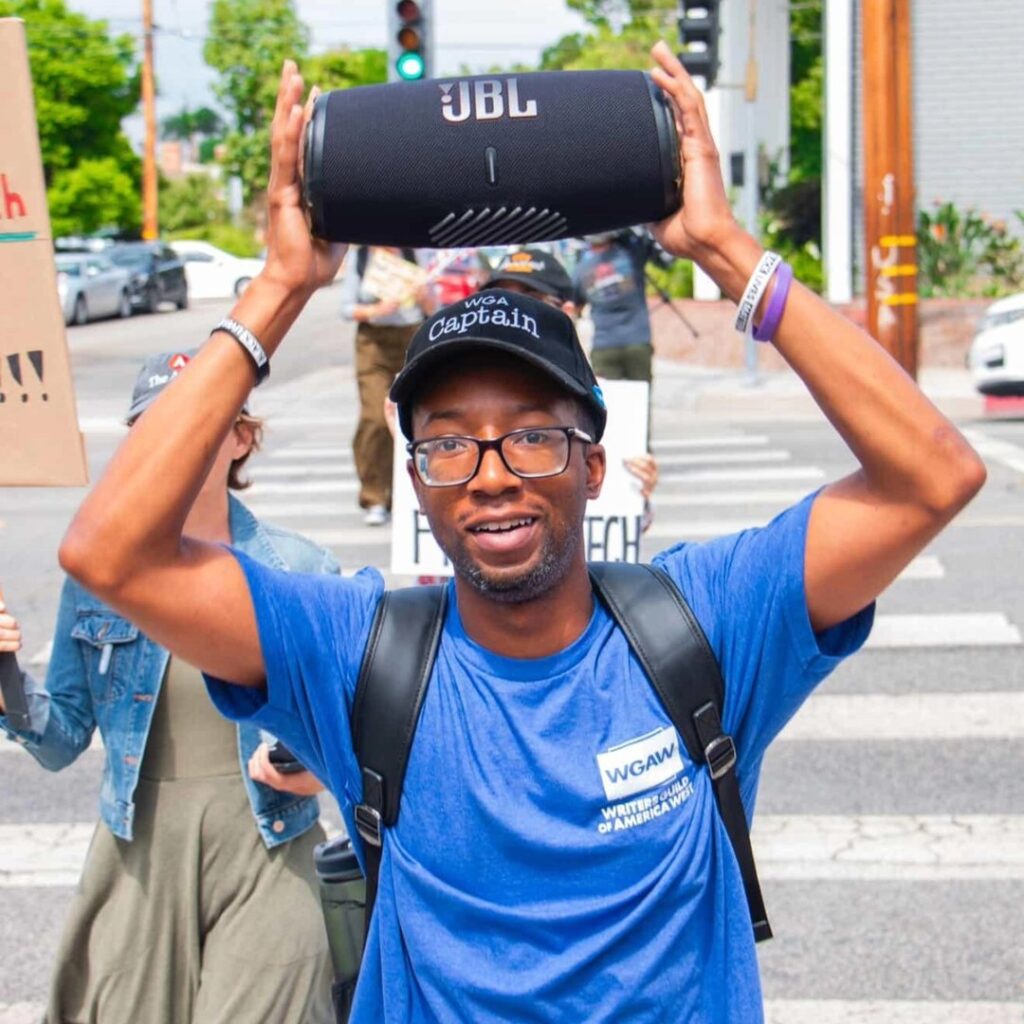 Hi, I’m Myles Warden. I’m a lower-level writer with a focus on half-hour comedy. While I may be newer to the guild, having officially joined right before the strike authorization vote, I hit the ground running, signing up to be a captain and a strike captain literally seconds after my new member meeting ended. During the strike, I was the assistant lot coordinator at Radford. I’m now a member of the Solidarity Steering Committee, the Committee of Black Writers, its subcommittee Strategy & Impact, and I’m a host on the WGA’s 3rd and Fairfax podcast.