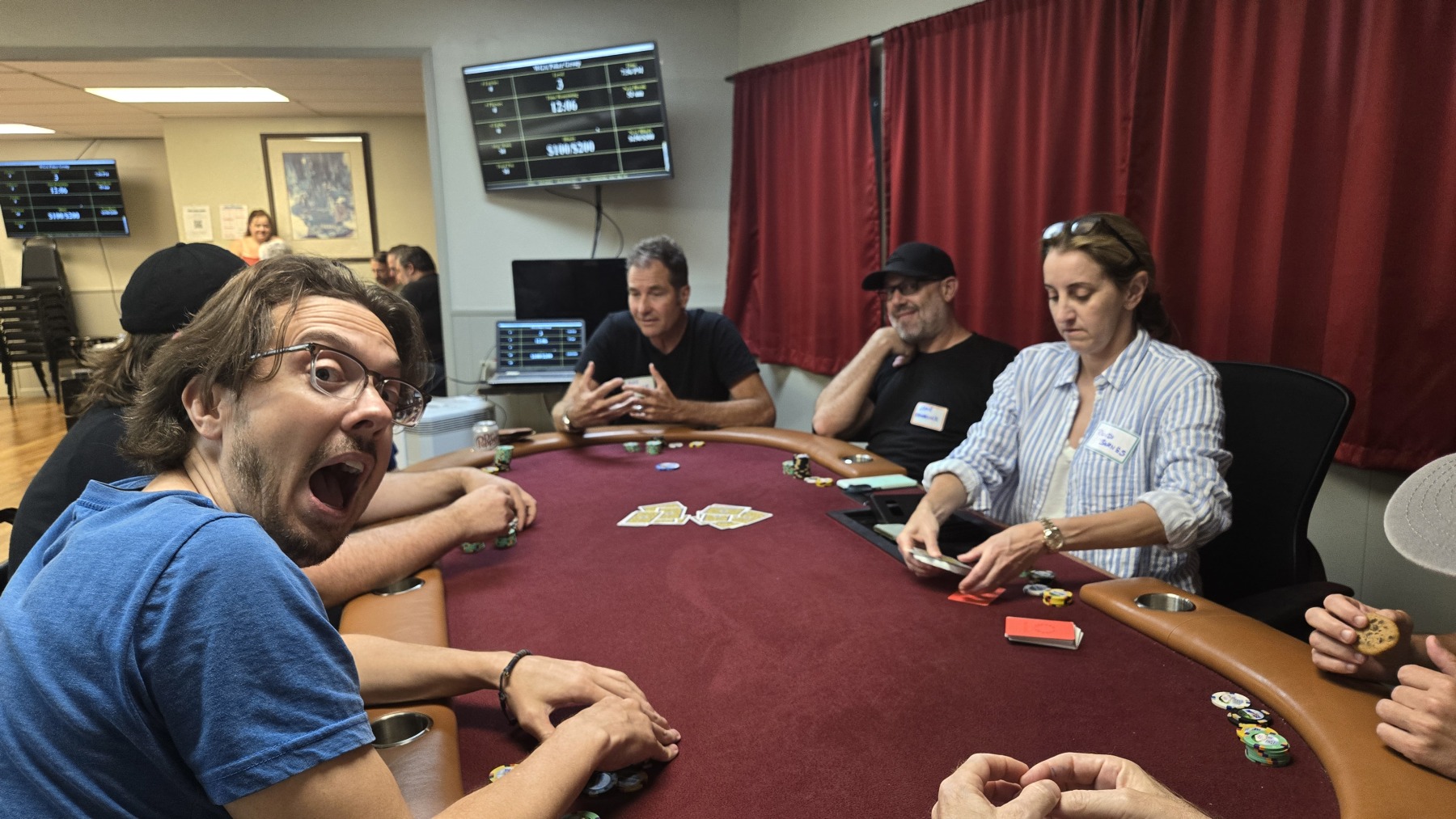 Excitement was in the air as the final nine gathered at the final table.  The fireworks started when Zach Robbins open shoved with A♥️Q♥️, followed by an overshove by Catherine Galutera holding 5♣️5♠️.  With a big stack and with chips already committed in the big blind, Nick Stanton decided to call with his 8♥️2♣️ for a chance at a double knockout.  Would it work, or would Zach and Catherine live to see another day?