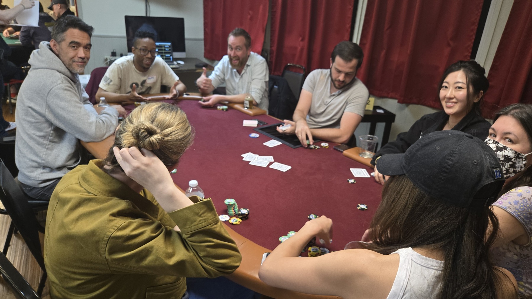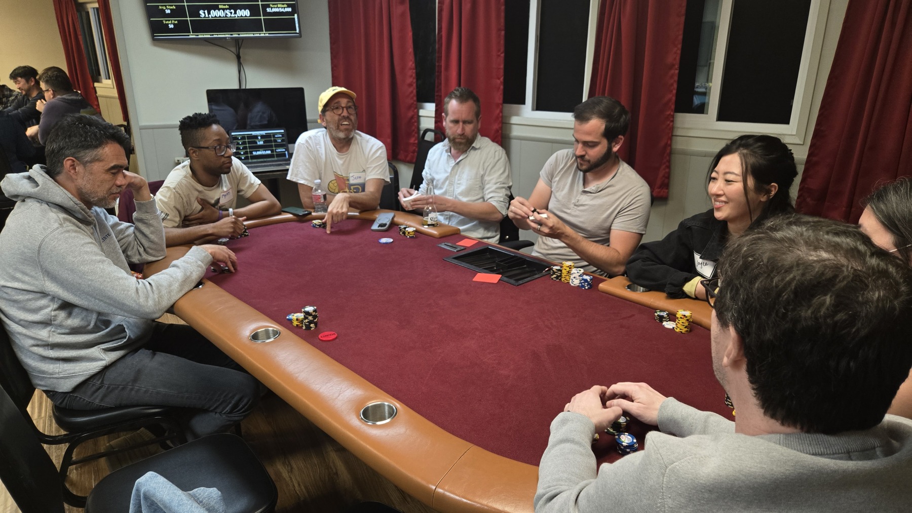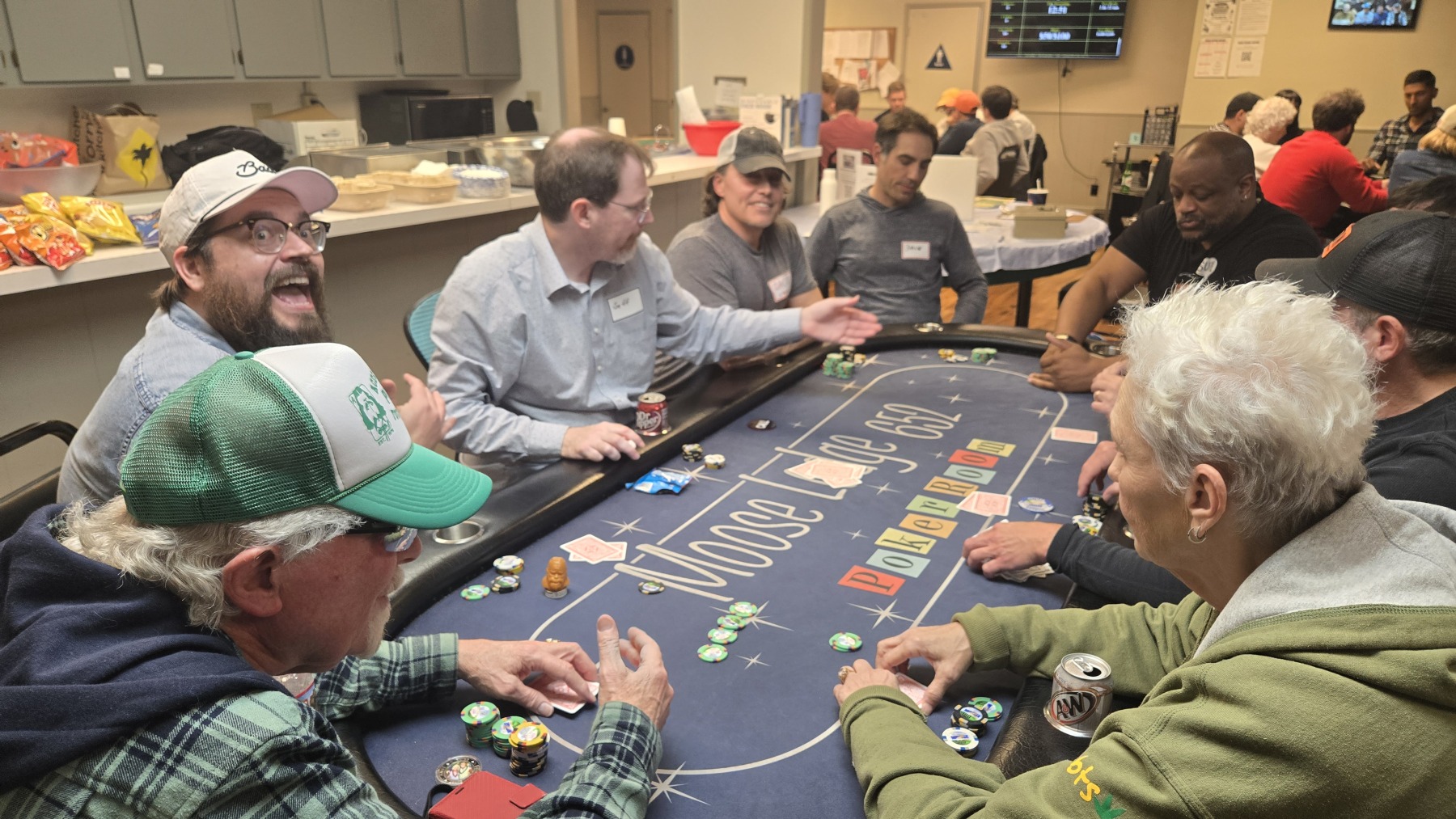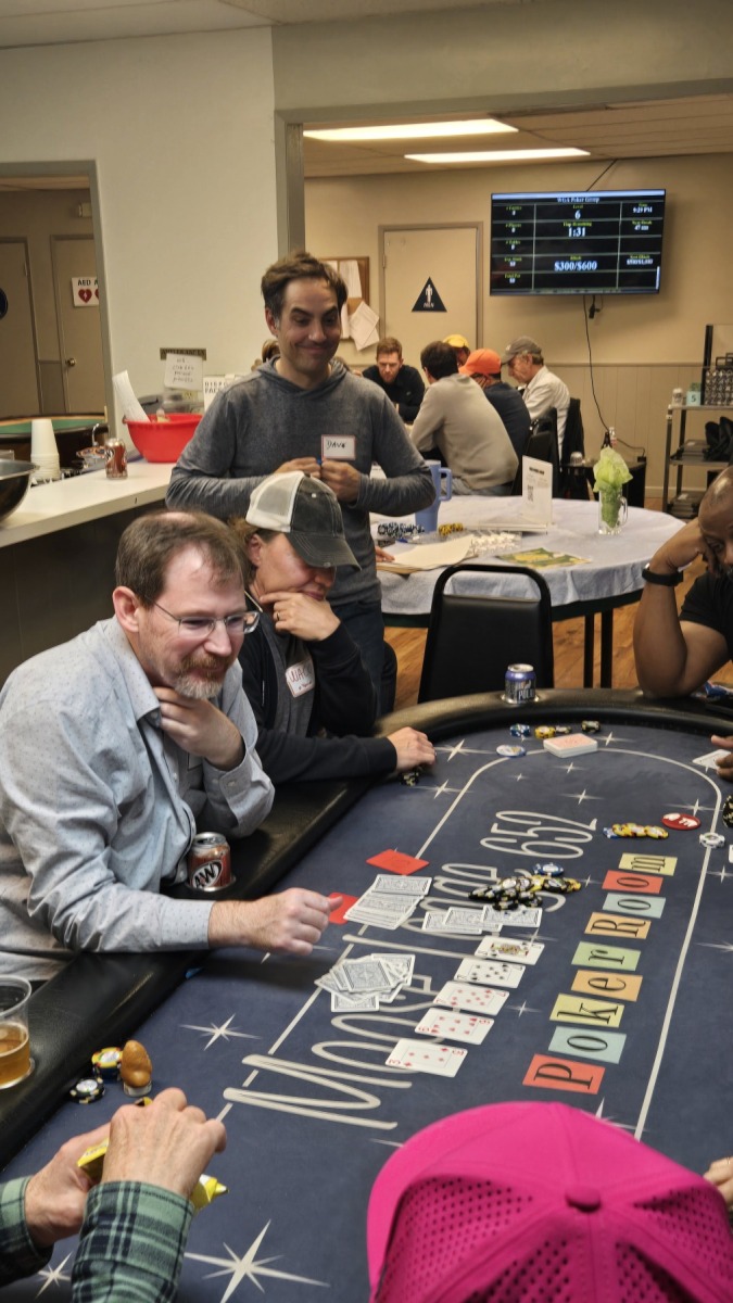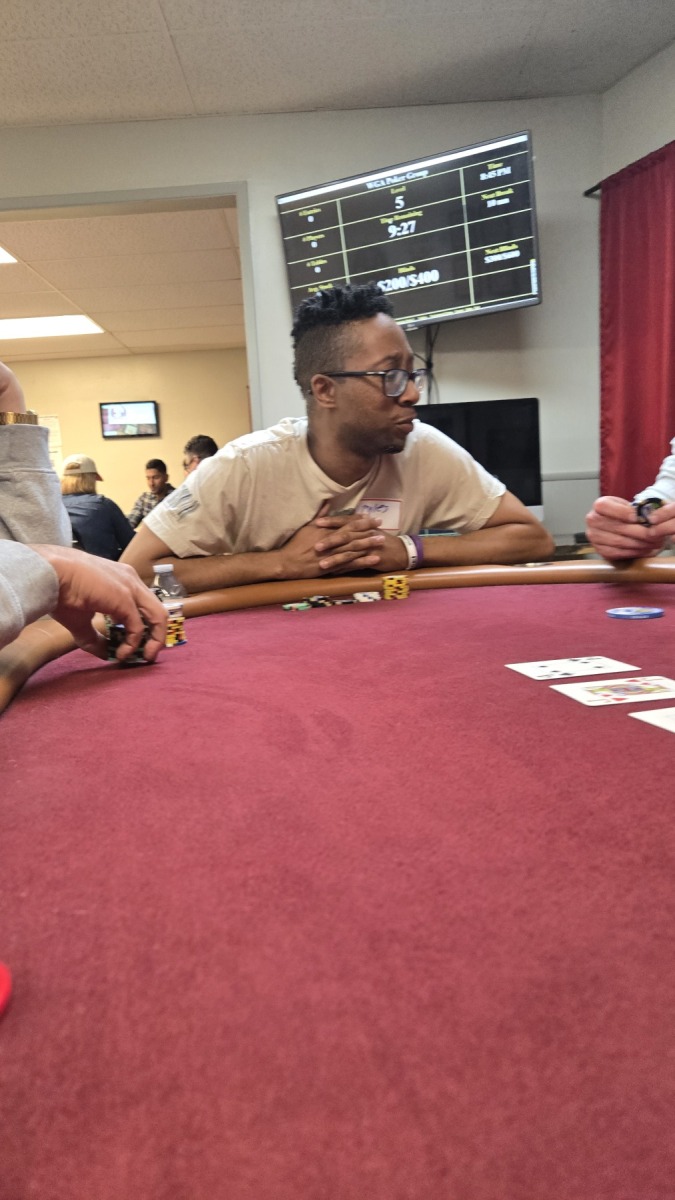 Final table frequent flyer, Jay “Moose” Moriarty, was next to wage war when his A♠️️T♠️️ clashed with Adam Cole’s K♦️️8♦️️. With their chips already in the middle, the flop of 5♣️️2♠️️J♦️️ kept Jay in the lead, as did the Q♥️️ on the turn. As long he could fade an 8 or King, Jay would score a huge win. Adam stared up at the poker gods and prayed. “One time!” Like a bolt of lightning, the 8♣️️ fell on the river to everyone’s shock and awe, leading Adam to double-up and leaving Jay with nothing but a single poker chip. But hey, “Chip and a chair, right?!” Unfortunately, a few hands later, Jason “Sneaky” Cho’s pocket queens defeated Jay’s Ace-Queen to earn him 5th place. The Moose was no longer on the loose.